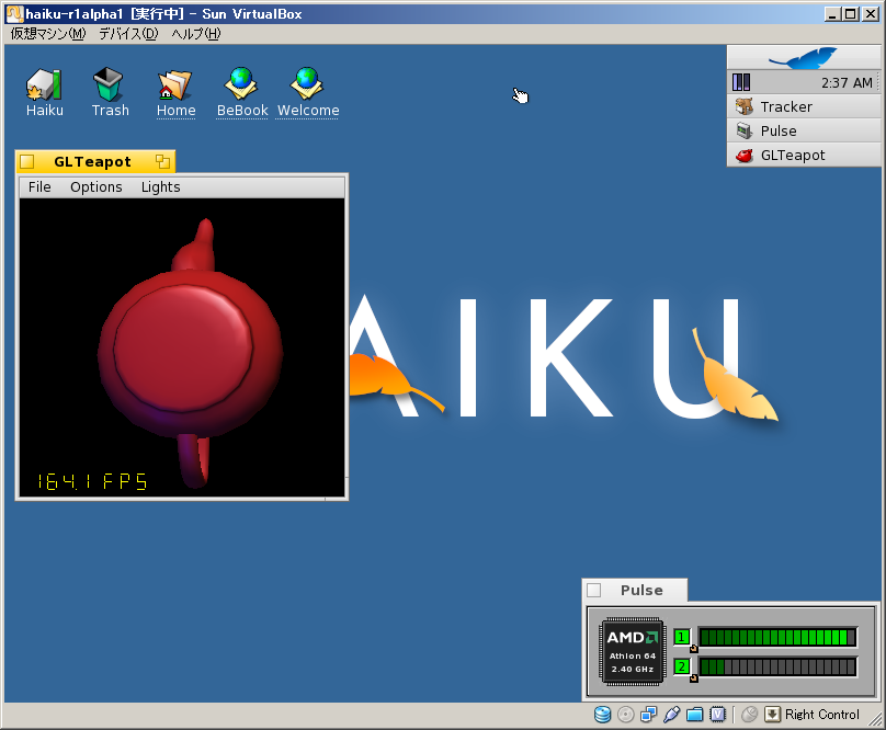 AMD-V が有効ならマルチプロセッサで動作します!! というわけで、スクリーンショットは先月リリースされたばかりの Haiku R1/alpha1! まるっきり BeOS です!!! 懐かしいなぁ~。 Haiku が x86-64 で動作するようになったら、これで選手権に出場したりして?! PR ![]() ![]() |