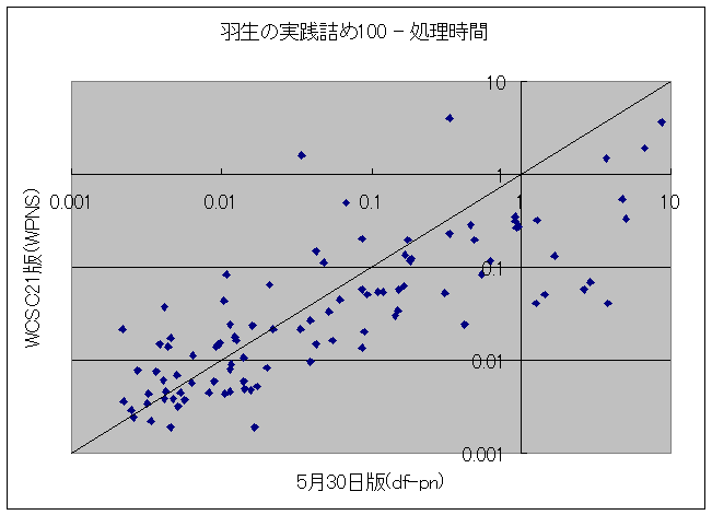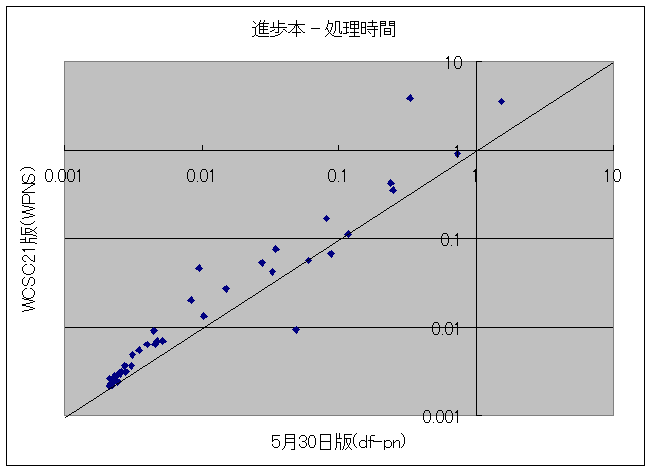 まだ、単純なdf-pnに岸本さんの最小距離法を組み合わせただけで、問題を解かせると回答率がやや低いので、とりあえず解けた問題だけ今年の選手権バージョンの詰ルーチンとの比較をしてみました。 すると、意外と健闘…というか、進歩本2の問題集では処理時間が短くなっていそうです。 もうひとつ、羽生の将棋 実戦[詰み&必死]200の詰め問題だとなんとなくまだ勝っているかな?という感じ。 (不詰証明が速い??) これはけっこう期待が持てるかも? と思いつつ、次回の選手権まであと11ヶ月で、あまりのんびりしていられない、か?! WCSC21版(WPNS):WPNS+最小距離法+証明駒・反証駒+優越関係+固定深さの詰ルーチン併用 5月30日版(df-pn):df-pn+最小距離法 aki.さんのd.hatena.ne.jp/ak11/20110515#p1に刺激されて、測定してみました。