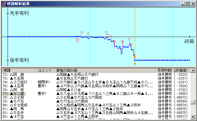 鈴木将棋から派生(?)したうさぴょんかられさぴょんを辿って今のなのはがあるので、ご先祖様?! 棋譜はこちら。 なのはは42手まで定跡データで44手目から思考ルーチンによる指し手です。 鈴木将棋は金を矢倉に囲ってしまい、玉が囲いの外にいるという危ない陣形で進み、77手目の先手▲8二銀に対して、なのはは詰みを読みきり△3七飛からの33手詰めに仕留めました!! (激指7は29手詰めと出てきたので少し冗長です。東大6は最初33手詰みで別解検索で23手) df-pnだと冗長な手を選ぶ可能性が高いから、時間がギリギリだとヤバイかも。レアケースだろうけど。 詰みを見つけた後はPonderでより短い手順を探索するとか工夫の余地はあるなぁ~。 ひとまずご先祖様に恩返しが出来てホッとしたのと、df-pn が活きたので今までの努力が無駄ではなかったという感動が。 これで3勝3敗。ちょっと息を吹き返して、もし最終局に勝ったら二次予選進出の目があるか?!