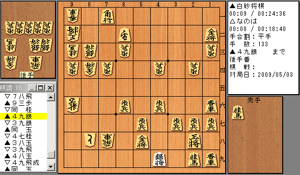 将棋の内容は判断できないので、激指7の解析(四段)をメインに。 1回戦は参加者の順位で1位とビリ、2位とブービー、と順番に対戦が決まるので、出場者が確定すれば対戦相手が確定するんだけど、1チーム到着していない…。 そこで折り返しが決まるので、来るか来ないかで相手が変わってくる。 参加プログラムを見ていると、「?!」なんと来ない場合は白砂将棋で互いにれさぴょんをルーツに持つ同門対決!! 結局、到着せずのっけから同門対決!! 負けられない相手である。 棋譜はこちら。 10手目までは定跡データで指していて、12手目から思考ルーチンになっています。 133手目の先手4九銀に対して、なのはは詰みを見つけました!! (棋譜の消費時間が10秒になっているのは10秒ウェイトをかけて音声再生をしているため) 17手かけて白砂将棋を仕留め、まずはさいさきのいい1勝目!! でも、「1000手くらいの詰みなら読みます」なんて言いました? 大会版は深さに制限をかけてるのでせいぜい64手くらいです。 激指先生の解析によると疑問手連発しながらも一応後手が優勢のまま勝ったようです。